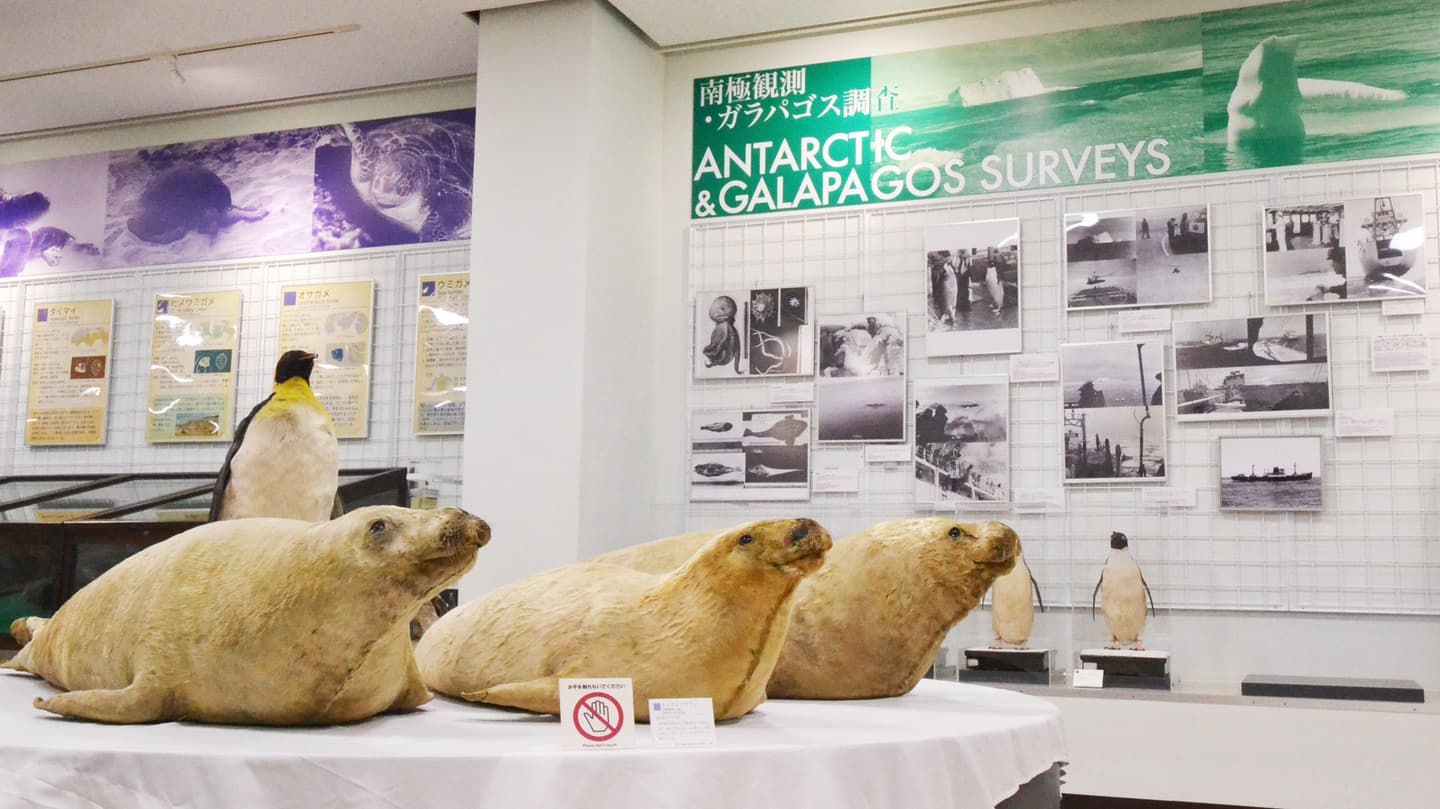 東京海洋大学品川キャンパス内にある博物館です。海の生きものの剥製や標本、漁具など約2000点の資料を展示しています。別館の鯨ギャラリーには、セミクジラ(体長17.1m 世界最大級)やコククジラ(体長12.79m)の全身骨格標本が展示され、その大きさは圧巻です。キャンパス奥には国の有形文化財に登録されている練習船「雲鷹丸」が設置されています。また今夏に南極海の展示をリニューアルいたしました。小さな生態系から繋がり、地球全体に広がる生態系についてぜひ皆さんも考えてみましょう。ご来館お待ちしております。