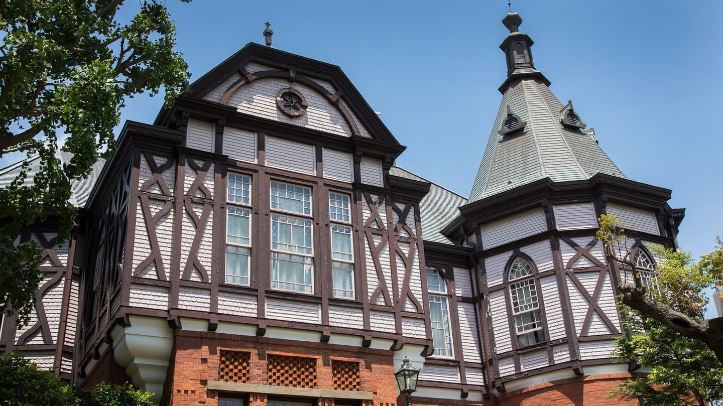 明治学院の正門をくぐり、11月下旬からはクリスマスツリーが立つ芝生を過ぎると右手に見えてくるのが明治学院記念館。1890(明治23)年に竣工し、1階はレンガ造、2階は木造のユニークな建物です。卒業生の島崎藤村は自伝的小説で記念館を描写しました。