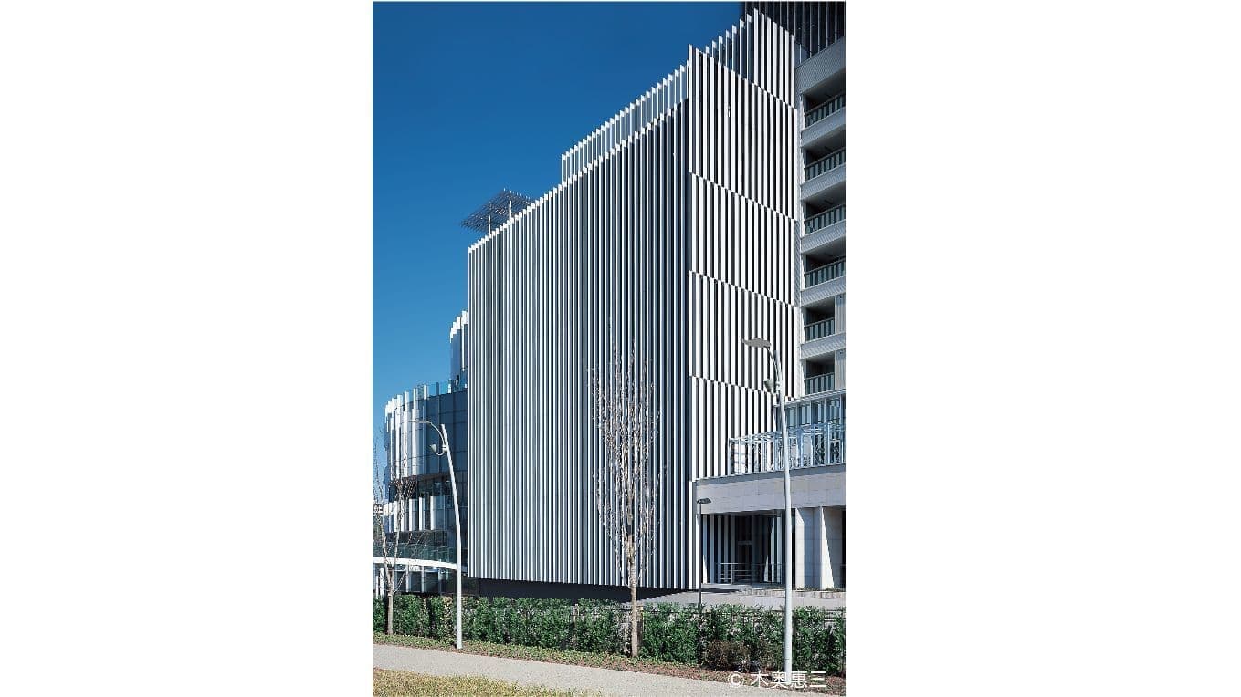「森の中の美術館」を建築コンセプトに設計された建物の南側は、波のようにうねるガラスカーテンウォールが美しい曲線を描き、円錐形の正面入口とともに個性的な外観を創り出しています。吹き抜けの1階ロビーからは、ガラス越しに、青山公園など地域の緑にとけこむように植栽された草木の四季折々の眺めを楽しむことができます。
