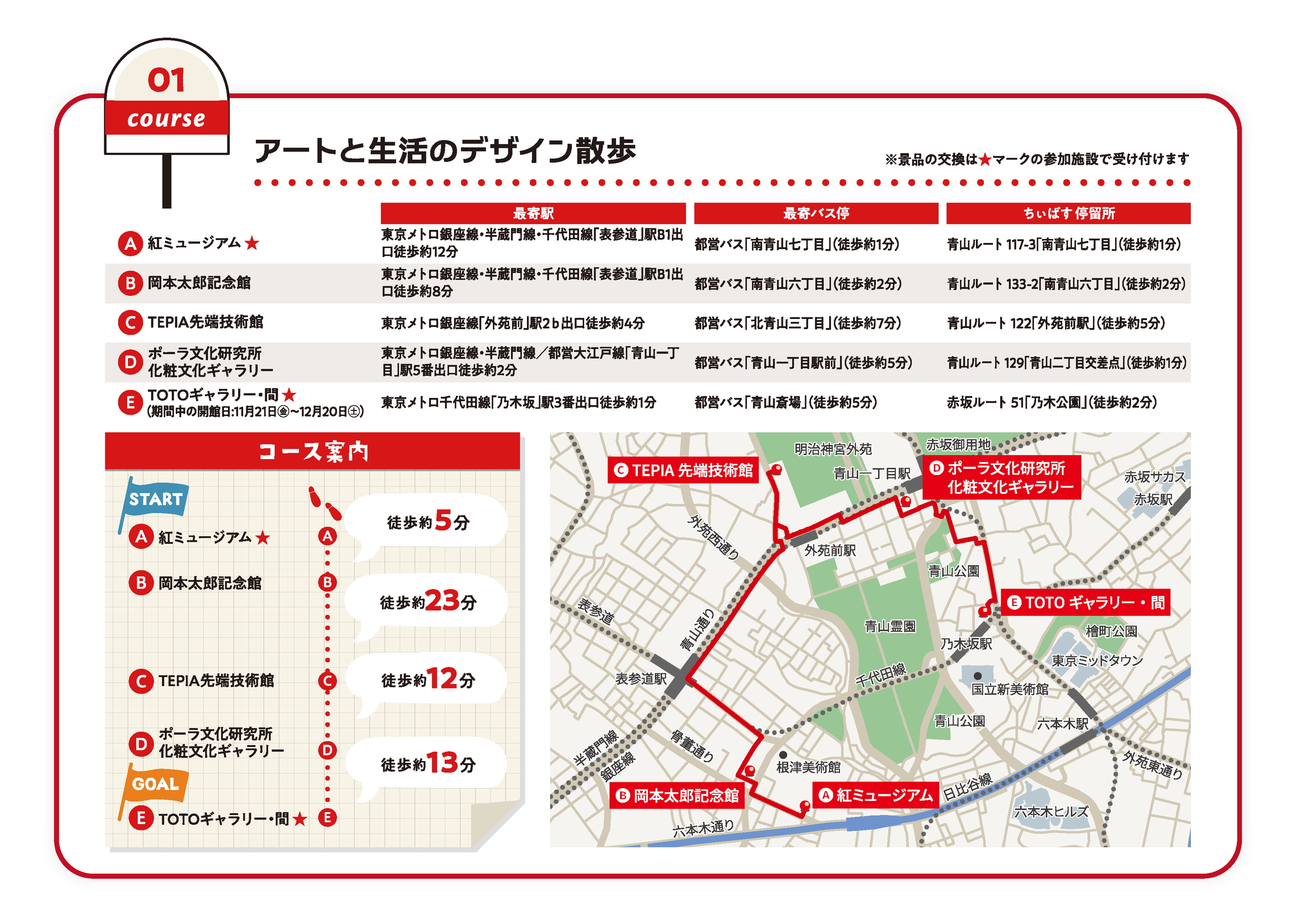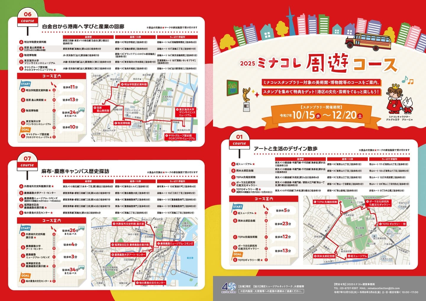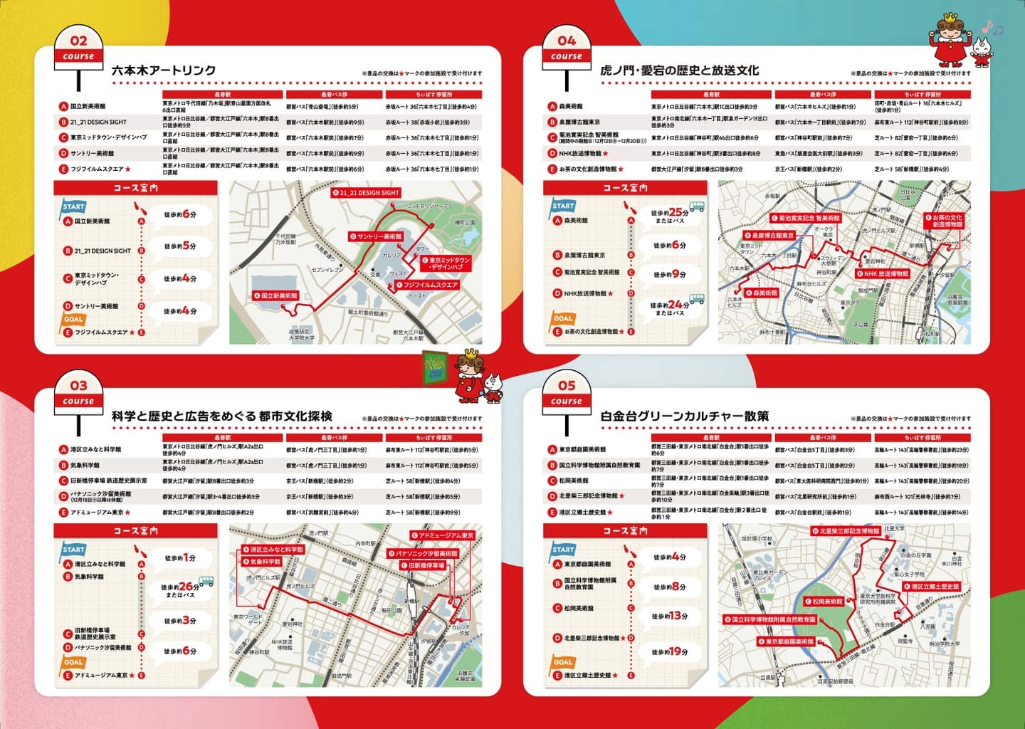 青山・六本木のアートスポットを歩くコースから、白金台や高輪の歴史と自然を感じるコース、新橋・虎ノ門の企業文化をたどるコースまで、どのルートも個性豊か。