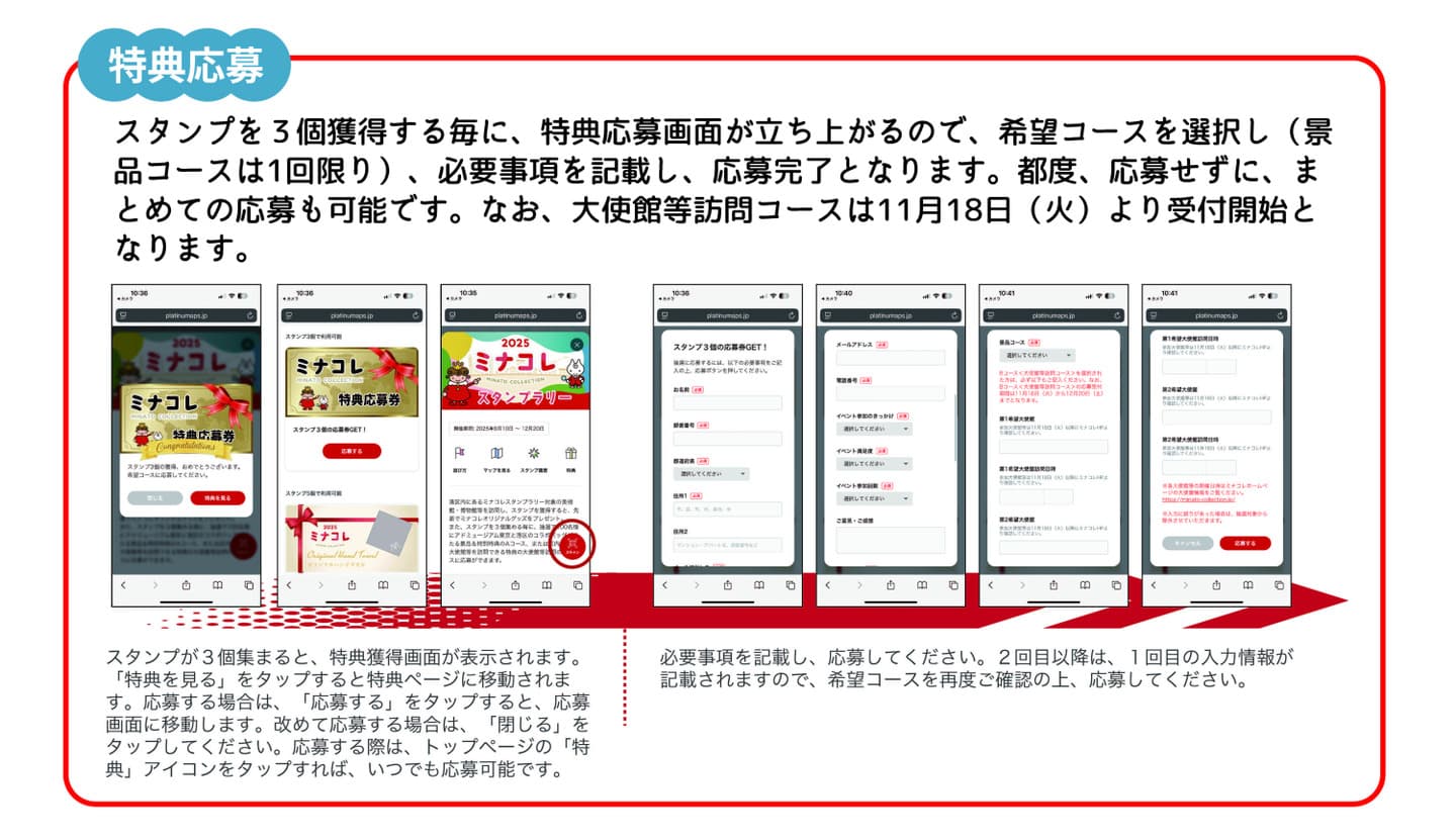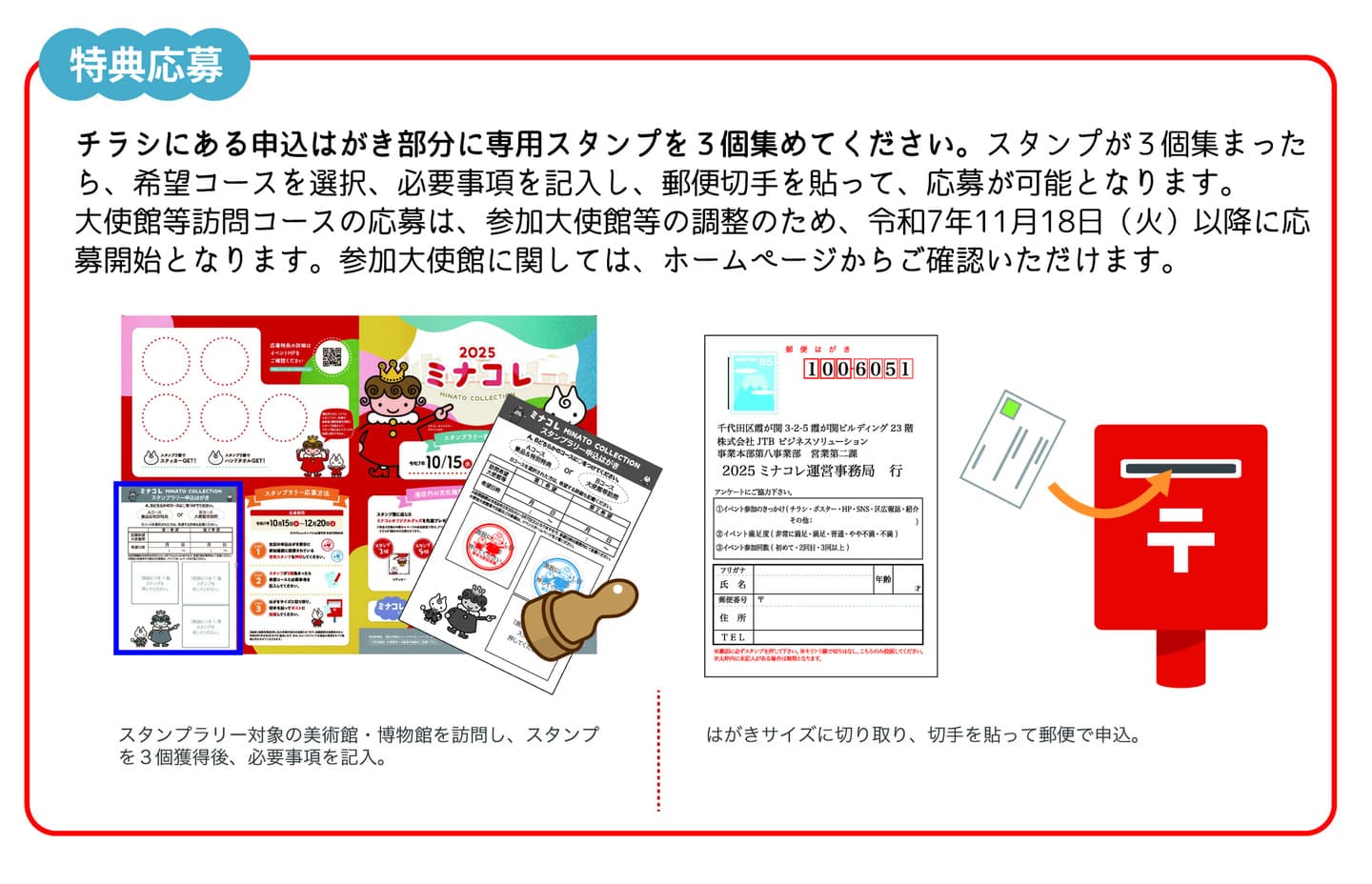 また、スタンプを3個集めると、抽選で100名様にアドミュージアム東京と港区のコラボバッグが当たる景品&特別特典のAコース、または区内にある大使館等を訪問できる特典の大使館等訪問のBコースに応募ができます。
